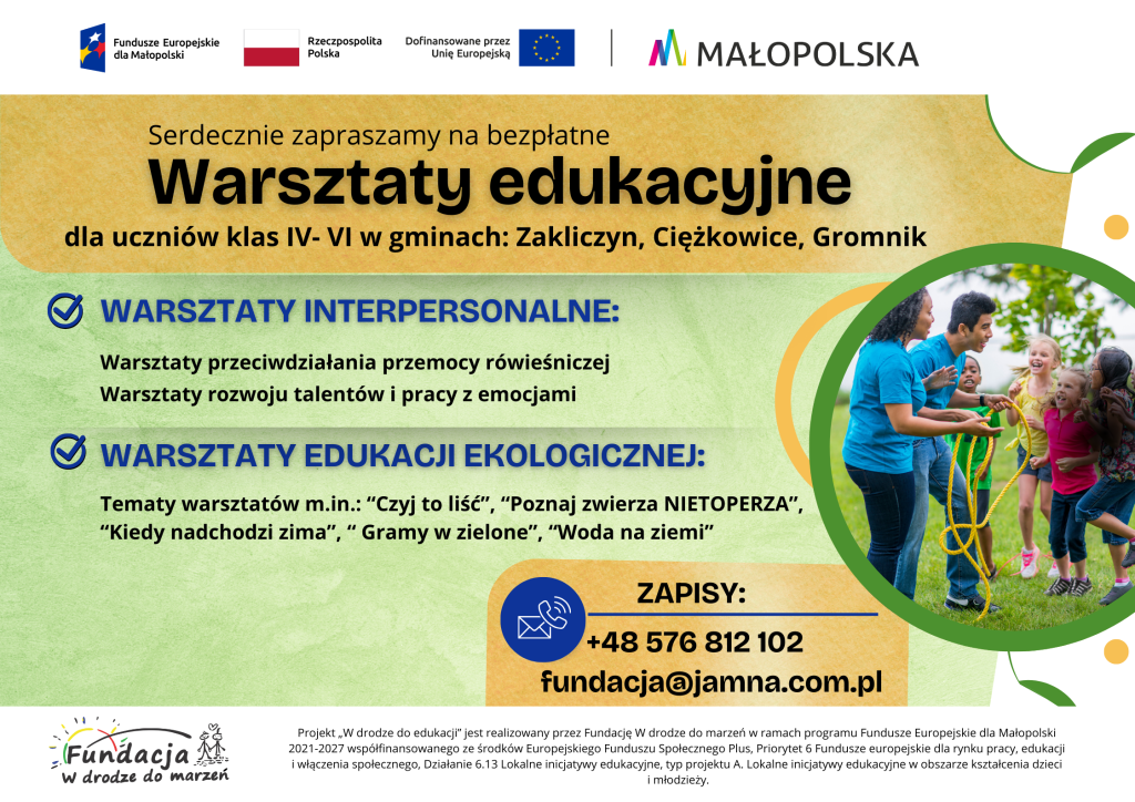 Projekt „W drodze do edukacji” jest realizowany przez Fundację w drodze do marzeń, w ramach programu Fundusze Europejskie dla Małopolski 2021-2027 współfinansowanego ze środków Europejskiego Funduszu Społecznego Plus, Priorytet 6 Fundusze europejskie dla rynku pracy, edukacji i włączenia społecznego, Działanie 6.13 Lokalne inicjatywy edukacyjne, typ projektu A. Lokalne inicjatywy edukacyjne w obszarze kształcenia dzieci i młodzieży